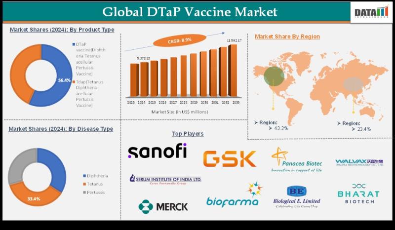 The DTaP Vaccine Market reached US$ 5,378.83 million in 2024 and is projected to reach US$ 11,592.17 million by 2033, growing at a CAGR of 8.9% during the forecast period 2025 to 2033.