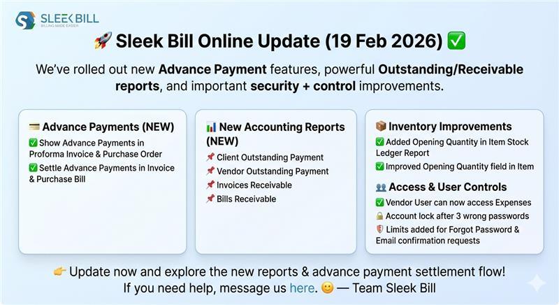 19 February 2026 Pune, India - Sleek Bill today announced a new product release for Sleek Bill Online, introducing improvements aimed at helping businesses manage advance payments, monitor pending receivables and payables, strengthen stock-opening accuracy, and improve account security.