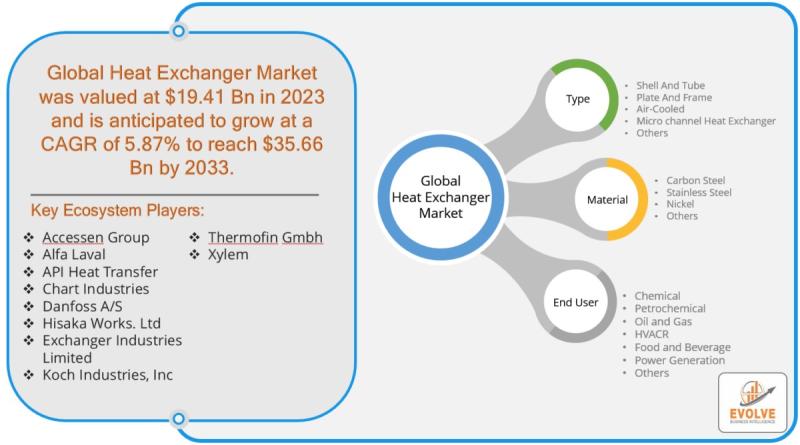 The global Heat Exchanger Market was valued at US$ 19.41 billion in 2023 and is projected to grow at a compound annual growth rate (CAGR) of 5.87% from 2023 to 2033. The growth of the market is largely driven by increasing energy efficiency regulations across industries, which are prompting companies to adopt heat exchanger systems for better energy conservation and reduced operational costs. However, high initial costs associated with the installation of heat exchangers can act as a restraint, particularly in cost-sensitive markets. Despite this challenge, the market presents significant opportunities due to the growing demand in emerging markets, where industrialization and infrastructure development are creating a need for more efficient thermal management solutions. As industries across the globe continue to prioritize sustainability and energy efficiency, the heat exchanger market is expected to experience steady growth, fueled by technological advancements and the expansion of renewable energy sources.For More Information: https://evolvebi.com/report/heat-exchanger-market-analysis/