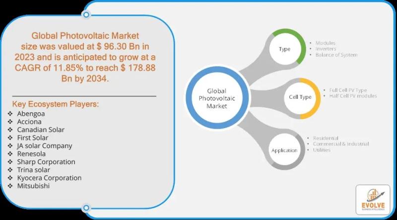 The global Photovoltaic (PV) Market was valued at US$ 96.30 billion in 2023 and is expected to grow at a robust compound annual growth rate (CAGR) of 11.85% from 2023 to 2033. This growth is primarily driven by the declining costs of solar PV systems, which have made solar energy more accessible and cost-effective for both residential and commercial applications. However, the market is challenged by the perception of high initial investment costs and ongoing issues within the raw material supply chain, which can hinder widespread adoption. Despite these obstacles, the development of advanced energy storage solutions presents significant opportunities for the photovoltaic market, as energy storage can address intermittency issues and enhance the overall efficiency and reliability of solar power systems. As a result, the photovoltaic market is poised for continued expansion, supported by technological advancements and increasing demand for sustainable energy solutions.For More Information: https://evolvebi.com/report/global-photovoltaic-market-analysis/