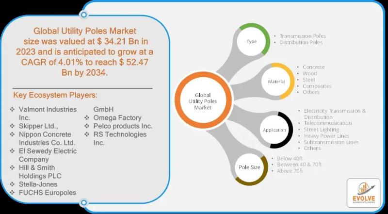 The global Utility Poles Market was valued at US$ 34.21 billion in 2023 and is expected to grow at a compound annual growth rate (CAGR) of 4.01% from 2023 to 2033. The market is primarily driven by technological advancements, particularly the integration of smart grids, which require modern, reliable utility poles for enhanced data communication, power distribution, and automation in electrical networks. However, high initial costs and installation challenges associated with utility poles, especially in urban areas or rugged terrains, are key restraining factors for the market. Despite these challenges, significant opportunities exist due to the increasing investment in smart grid infrastructure, which is being adopted globally to improve energy efficiency, grid reliability, and resilience. As countries transition to smart grids and prioritize the modernization of their power networks, the demand for advanced utility poles equipped with sensors, communication systems, and renewable energy capabilities is expected to rise, providing substantial growth potential for the market.For More Information: https://evolvebi.com/report/utility-poles-market-analysis/