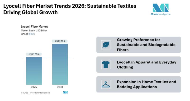According to Mordor Intelligence, the Lyocell fiber market was valued at USD 1.58 billion in 2025 and is projected to reach USD 2.33 billion by 2030, supported by steady demand from apparel, home textiles, and hygiene applications.