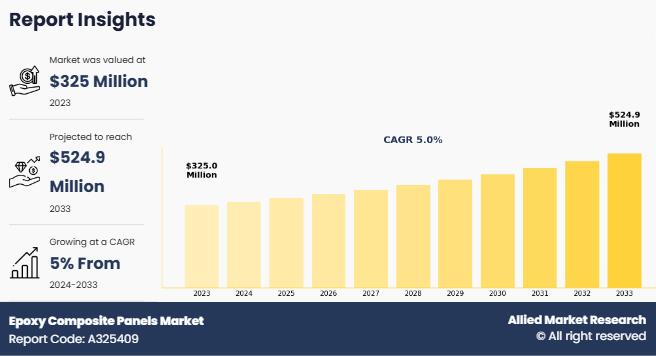 Allied Market Research published a report, titled, "Epoxy Composite Panels Market by End-use Industry (Automotive, Marine, Architectural, Building and Construction, Others): Global Opportunity Analysis and Industry Forecast, 2024-2033". According to the report, the "epoxy composite panels market" was valued at $325 million in 2023, and is estimated to reach $524.9 million by 2033, growing at a CAGR of 5% from 2024 to 2033.