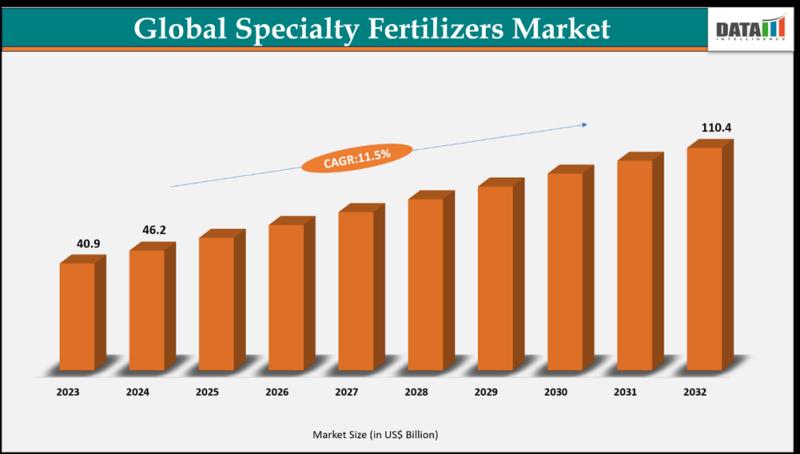 The global specialty fertilizers market reached US$40.9 billion in 2023, rising to US$46.2 billion in 2024 and is expected to reach US$110.4 billion by 2032, growing at a CAGR of 11.5% from 2025 to 2032. as agricultural producers increasingly adopt advanced, high-efficiency nutrient solutions to maximize crop yield, quality, and resource use efficiency.