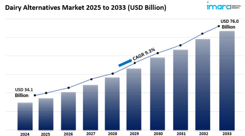 IMARC Group, a leading market research company, has recently released a report titled "Dairy Alternatives Market Report by Source (Almond, Soy, Oats, Hemp, Coconut, Rice, and Others), Formulation Type (Plain, Flavored), Nutrient (Protein, Starch, Vitamin, and Others), Distribution Channel (Supermarkets and Hypermarkets, Convenience Stores, Online Stores, and Others), Product Type (Cheese, Creamers, Yogurt, Ice Creams, Milk, and Others), and Region 2025-2033". The study provides a detailed analysis of the industry, including the global dairy alternatives market trends, share, size, and industry trends forecast. The report also includes competitor and regional analysis and highlights the latest advancements in the market.The global dairy alternatives market size reached USD 34.1 Billion in 2024. Looking forward, IMARC Group expects the market to reach USD 76.0 Billion by 2033, exhibiting a growth rate (CAGR) of 9.3% during 2025-2033.