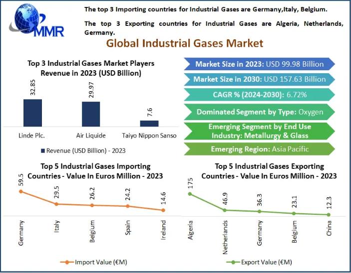 Emerging trends in the industrial gases market include the integration of digital technologies for enhanced operational efficiency and monitoring, such as IoT-based tracking systems. The growing emphasis on sustainability is driving the development of green hydrogen and carbon capture technologies. Additionally, the use of industrial gases in advanced healthcare applications, such as in minimally invasive surgeries and respiratory support systems, is expanding. The increasing focus on customized gas solutions tailored to specific industry needs and the adoption of cryogenic storage and transportation methods are also shaping the future of this market.
