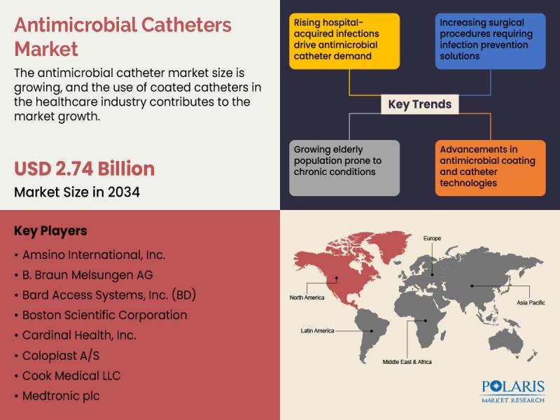 Global Antimicrobial Catheters Market is currently valued at USD 1.29 Billion in 2025 and is anticipated to generate an estimated revenue of USD 2.74 Billion by 2034, according to the latest study by Polaris Market Research. Besides, the report notes that the market exhibits a robust 8.7% Compound Annual Growth Rate (CAGR) over the forecasted timeframe, 2026 - 2034