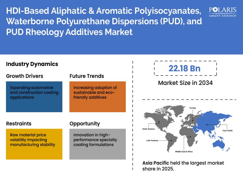 Global HDI-Based Aliphatic & Aromatic Polyisocyanates, Waterborne Polyurethane Dispersions (PUD), and PUD Rheology Additives Market is currently valued at USD 13.16 Billion in 2025 and is anticipated to generate an estimated revenue of USD 22.18 Billion by 2034, according to the latest study by Polaris Market Research. Besides, the report notes that the market exhibits a robust 6.4% Compound Annual Growth Rate (CAGR) over the forecasted timeframe, 2026 - 2034