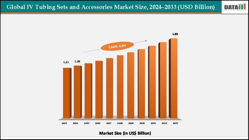 IV tubing sets and accessories market reached US$ 1.21billion in 2023, with a rise to US$ 1.26 billion in 2024, and is expected to reach US$ 1.83billion by 2033, growing at a CAGR of 4.8% during the forecast period 2025-2033.