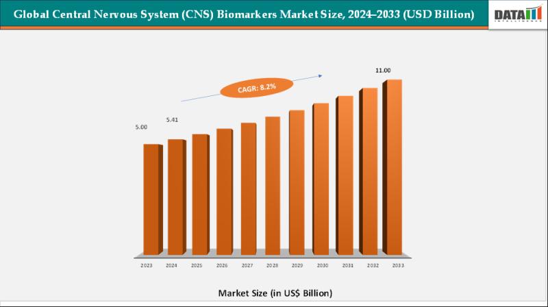 As per DataM intelligence research report" The global central nervous system (CNS) biomarkers market reached US$ 5.00 billion in 2023, with a rise to US$ 5.41 billion in 2024, and is expected to reach US$ 11.00 billion by 2033, growing at a CAGR of 8.2% during the forecast period 2025-2033." Early neurological diagnosis and drug development needs are driving biomarker research.