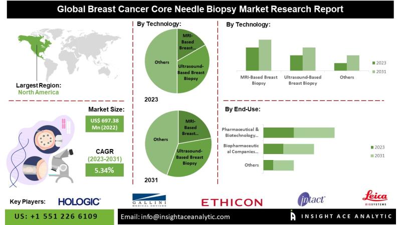 InsightAce Analytic Pvt. Ltd. announces the release of a market assessment report on the "Global Breast Cancer Core Needle Biopsy Market - (By Technology (MRI-based Breast Biopsy, Ultrasound-based Breast Biopsy, Mammography-based (Stereotactic) Breast Biopsy, CT-based Breast Biopsy, Other Image Based Breast Biopsy), By End-use (Hospitals & Diagnostic Laboratories, Pharmaceutical & Biotechnology Companies, Academic & Research Institutes)), Trends, Industry Competition Analysis, Revenue and Forecast To 2031."According to the latest research by InsightAce Analytic, the Global Breast Cancer Core Needle Biopsy Market is valued at US$ 697.3 Mn in 2023, and it is expected to reach US$ 1,042.3 Mn by 2031, with a CAGR of 5.34% during the forecast period of 2024-2031.