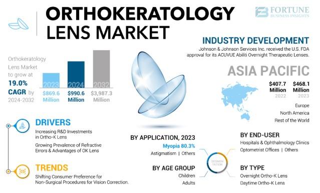 The orthokeratology lens market size was valued at USD 869.6 million in 2023 and is projected to grow from USD 990.6 million in 2024 to USD 3,987.3 million by 2032, recording a CAGR of 19.0% during the forecast period (2024-2032).The orthokeratology (Ortho-K) lens market has emerged as a transformative segment within the vision care industry, offering non-invasive solutions for refractive error correction. With growing demand for advanced myopia management, increasing FDA approvals, and technological innovations, the market is poised for substantial growth.