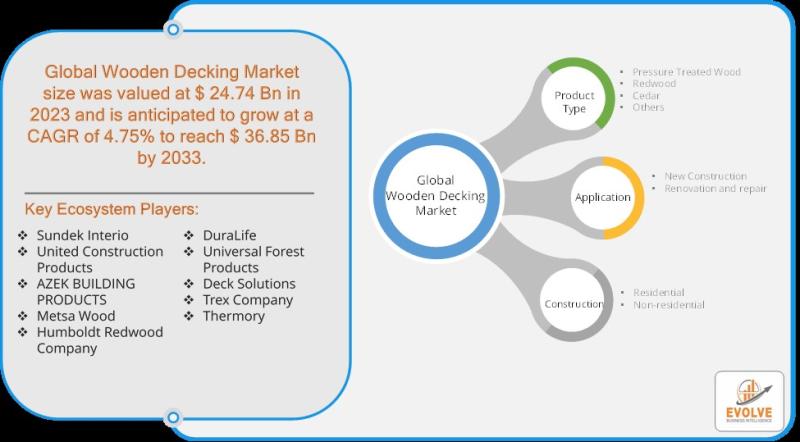 The Wooden Decking Market, valued at US$ 24.74 billion in 2023, is expected to grow at a compound annual growth rate (CAGR) of 4.74% from 2023 to 2033. The market's expansion is primarily driven by the growth of the construction industry, as demand for residential, commercial, and recreational spaces increases. Wooden decking, known for its aesthetic appeal, durability, and sustainability, remains a popular choice for outdoor spaces, driving its demand in both new construction and renovation projects. However, the market faces challenges related to the increasing cost of lumber and wood products. Rising prices for raw materials, influenced by factors such as supply chain disruptions and environmental regulations, are putting pressure on manufacturers and consumers alike, potentially hindering market growth. Despite these challenges, there are significant opportunities for innovation and market growth, particularly through technological advancements in wooden decking. New treatments, finishes, and materials are enhancing the performance, longevity, and sustainability of wooden decking, making it more appealing to consumers. Additionally, innovations in composite wood decking and environmentally friendly production methods present opportunities for market expansion, catering to the growing demand for eco-conscious construction solutions.For More Information: https://evolvebi.com/report/wooden-decking-market-analysis/
