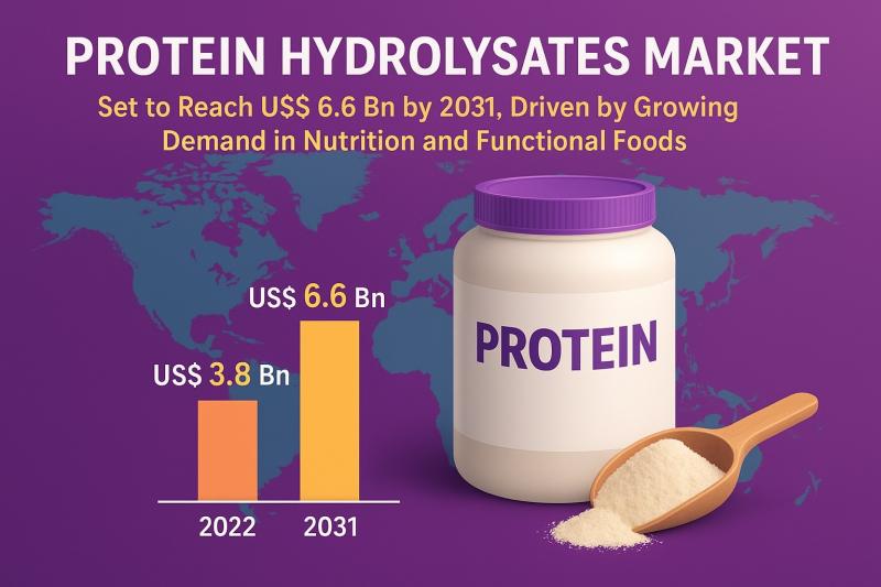 The global protein hydrolysates market was valued at US$ 3.8 billion in 2022. It is projected to grow at a CAGR of 6.1% from 2023 to 2031, reaching US$ 6.6 billion by 2031. The market growth is driven by increasing demand for functional foods, nutritional supplements, sports nutrition products, and infant formula, alongside rising consumer awareness about protein-enriched diets.