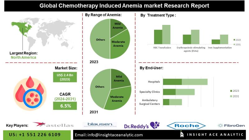 InsightAce Analytic Pvt. Ltd. announces the release of a market assessment report on the "Global Chemotherapy-Induced Anemia Market- (By Type of Anemia (Mild Anemia, Moderate Anemia, Severe Anemia, Life-Threatening Anemia), By Treatment Type (RBC Transfusion, Erythropoiesis-stimulating agents (ESAs), Iron Supplementation), By Drug Type (Epogen Injection, Procrit Injection, Androxy Oral, Aranesp Injection, Epoetin Alfa Injection, and Others), End User (Hospitals, Specialty Clinics, Ambulatory Surgical Centers, Others)), By Region, Trends, Industry Competition…