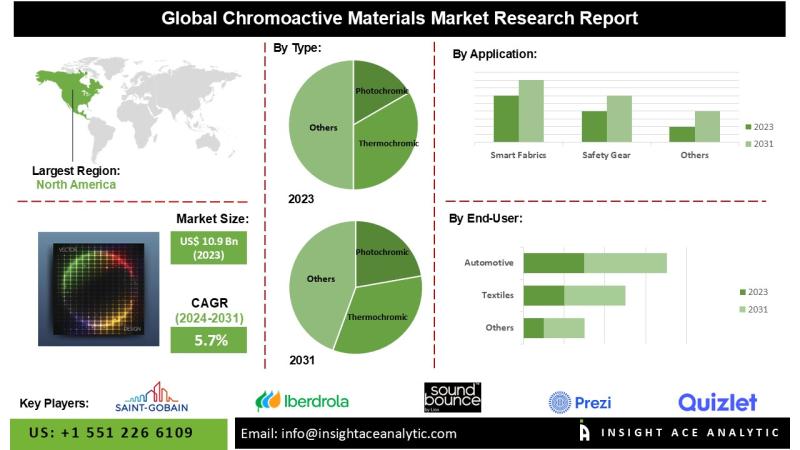InsightAce Analytic Pvt. Ltd. announces the release of a market assessment report on the "Global Chromoactive Materials Market - (By Type (Photochromic, Thermochromic, Electrochromic, Piezochromic, Others), By Application (Smart Fabrics, Safety Gear, Smart Windows, Interior Elements, Smart Glass, e-Paper and e-Ink, Smart Labels and Indicators, Diagnostic Tools, Others), By End-use (Textiles, Automotive, Construction, Electrical and Electronics, Packaging, Healthcare, Others)), Trends, Industry Competition Analysis, Revenue and Forecast To 2031."