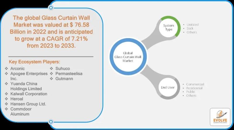 The Glass Curtain Wall Market, valued at US$ 76.58 billion in 2022, is poised for substantial growth with a projected CAGR of 7.21% from 2023 to 2033. Technological advancements are driving this growth, enabling the development of more efficient, aesthetically pleasing, and durable glass curtain wall systems. These innovations are enhancing the energy efficiency of buildings, reducing maintenance costs, and improving overall building performance, thereby attracting significant interest from the construction and architectural sectors. However, the market faces challenges such as the perception of high initial costs associated with glass curtain wall installations and economic uncertainties that can impact investment decisions in large-scale construction projects. Despite these challenges, there are significant opportunities for market expansion, particularly in the adoption of sustainable and green building practices. As environmental concerns and regulations continue to rise, the demand for eco-friendly and energy-efficient building solutions, including glass curtain walls, is expected to grow. The market's future looks promising as key players and stakeholders increasingly focus on sustainability, integrating advanced technologies to meet stringent environmental standards and cater to the evolving preferences of modern architecture. This trend towards green building practices is set to create new growth avenues and reinforce the importance of glass curtain walls in contemporary and future construction projects.For More Information: https://evolvebi.com/report/glass-curtain-wall-market-analysis/