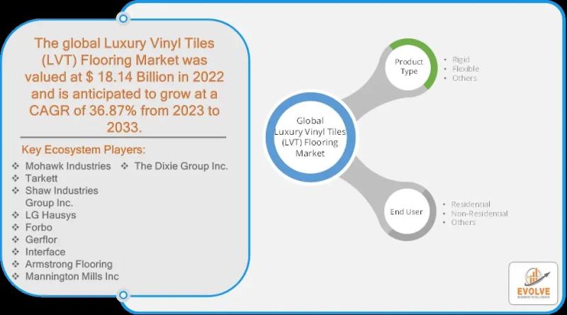 The Luxury Vinyl Tiles (LVT) Flooring Market, valued at US$ 18.14 billion in 2022, is experiencing rapid growth with a projected CAGR of 36.87% from 2023 to 2033. This robust expansion is primarily driven by technological advancements that have significantly enhanced the aesthetics, durability, and installation processes of LVT flooring, making it an attractive choice for both residential and commercial applications. However, the market faces challenges such as the perception of price sensitivity and concerns regarding the durability of lower-quality products, which can affect consumer trust and adoption rates. Despite these restraining factors, the market presents substantial opportunities, particularly in the growing demand for sustainability and eco-friendly products. Consumers and businesses are increasingly prioritizing environmentally responsible choices, driving manufacturers to innovate and offer greener alternatives. This trend towards sustainable and eco-friendly LVT flooring is expected to further boost market growth, providing a competitive edge to companies that can effectively meet these evolving demands. Overall, the LVT flooring market is poised for significant expansion, leveraging technological innovations and the rising emphasis on sustainability.For More Information: https://evolvebi.com/report/luxury-vinyl-tiles-flooring-market-analysis/