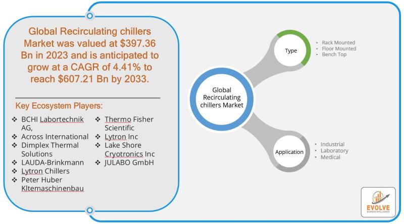 The Recirculating Chillers Market was valued at US$ 397.36 billion in 2023 and is projected to grow at a CAGR of 4.41% from 2023 to 2033. This growth is primarily driven by technological advancements in cooling systems, which have led to improved efficiency, energy conservation, and integration with other industrial processes. These advancements have enhanced the capabilities of recirculating chillers in various industries, including pharmaceuticals, manufacturing, and laboratories, where precise temperature control is critical. However, the market faces some challenges, particularly the perception of high operational and maintenance costs, which may deter some potential customers from adopting recirculating chillers despite their long-term energy efficiency benefits. Additionally, the complexity of maintenance and the need for specialized knowledge to operate these systems can contribute to the overall costs. Despite these challenges, the market offers significant opportunities, especially with the growing focus on research and development in cooling technologies. Innovations aimed at improving energy efficiency, and sustainability, and lowering the overall lifecycle costs of recirculating chillers are expected to drive future growth. Industries are increasingly recognizing the importance of advanced cooling systems, fueling demand for more innovative, cost-effective solutions. The market's expansion is further supported by the increasing need for efficient temperature control solutions across diverse sectors globally.For More Information: https://evolvebi.com/report/recirculating-chillers-market-analysis/