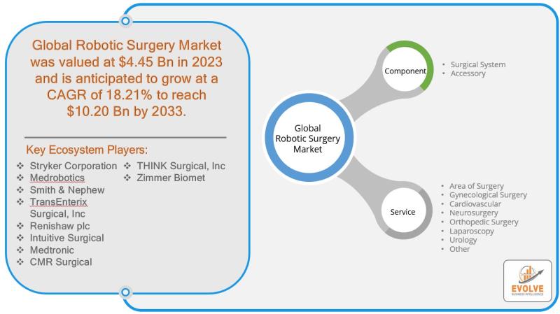 The Robotic Surgery Market is expected to experience significant growth, with a market size of US$ 4.45 billion in 2023, projected to expand at a robust CAGR of 18.21% from 2023 to 2033. The primary driving factor behind this growth is the continuous advancements in surgical technology, which have led to more precise, minimally invasive procedures, reducing recovery times and improving patient outcomes. Robotic surgery offers significant advantages, including enhanced dexterity, greater accuracy, and the ability to perform complex procedures with improved control, making it an attractive option for both surgeons and patients. However, the market faces some challenges, notably the high initial costs and maintenance expenses associated with robotic surgical systems, which can be a significant barrier for healthcare institutions, especially in emerging markets. Despite these constraints, the market presents ample opportunities, particularly with the expanding applications and specializations of robotic surgery, such as in orthopedics, urology, and cardiology. As the technology continues to evolve and more healthcare providers adopt robotic systems, the market is poised for substantial growth. Additionally, increasing healthcare investments, technological advancements in AI and machine learning, and growing demand for minimally invasive surgeries further fuel the market's expansion prospects.For More Information: https://evolvebi.com/report/robotic-surgery-market-analysis/