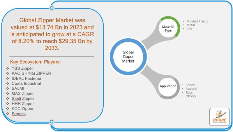 The global Zipper Market is expected to reach a size of US$ 13.74 billion in 2023 and is projected to grow at a CAGR of 8.20% from 2023 to 2033. The growth of the market is primarily driven by the increasing demand for both functional and fashionable apparel, as zippers are essential components in a wide range of clothing, accessories, and bags. The fashion industry's evolving trends and the need for high-performance zippers in activewear, outerwear, and sportswear further fuel this demand. However, the market faces challenges, including fluctuating raw material costs, which can impact production expenses and pricing strategies. Opportunities for market growth lie in the growing e-commerce and digitalization trends, which have expanded the reach of zipper manufacturers to global markets. The rise of online retail platforms allows brands to cater to a larger customer base and meet the rising demand for custom and innovative zipper designs. Additionally, there is a growing emphasis on sustainability and eco-friendly zipper options, which aligns with the broader trends in the fashion industry toward environmentally conscious practices. This shift is creating new opportunities for market players to differentiate their offerings and capture niche segments of the market.For More Information: https://evolvebi.com/report/zipper-market-analysis/