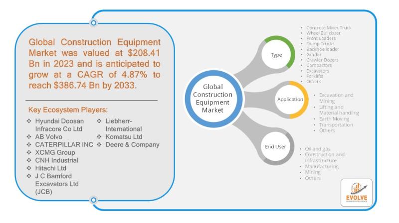 The Construction Equipment Market is projected to reach a size of US$ 208.41 billion in 2023, experiencing a compound annual growth rate (CAGR) of 4.87% from 2023 to 2033. This market is primarily driven by significant infrastructure development across the globe, fueling demand for various types of construction machinery and equipment. Governments and private sectors are increasingly investing in infrastructure projects such as roads, bridges, and smart cities, thereby bolstering market growth. However, the market faces challenges due to the volatility in raw material prices, which can impact production costs and profit margins for manufacturers. Fluctuating prices of essential raw materials like steel and rubber add a layer of uncertainty to the market, potentially hampering growth. Despite these challenges, the market presents substantial opportunities, particularly in the adoption of green construction equipment. With a growing emphasis on sustainability and reducing carbon footprints, there is a rising demand for eco-friendly machinery that incorporates advanced technologies to enhance energy efficiency and reduce emissions. This shift towards green construction equipment is expected to open new avenues for innovation and growth in the market, as companies strive to develop and offer sustainable solutions to meet regulatory standards and consumer expectations.For More Information: https://evolvebi.com/report/construction-equipment-market-analysis/