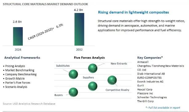 According to USD Analytics the Global Structural Core Materials Market Size is valued at $2.6 Billion in 2024 and is forecast to register a growth rate (CAGR) of 6.3% to reach $4.2 Billion by 2032.