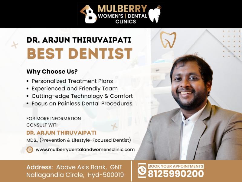Choosing the best dentist is an essential step in maintaining long term oral health and overall well being. Mulberry Dental and Womens Care Clinic is the best dental clinic in Hyderabad, offering expert care that goes beyond just addressing dental issues. With the expert guidance of Dr. Arjun Thiruvaipati and the dedicated team, patients receive care that ensures optimal oral health and overall wellness. We prioritize preventive care, ensuring that issues are addressed before they become major concerns. Don't wait until dental problems arise, schedule an appointment today at Mulberry Dental and womens care Clinic and take the first step towards maintaining a healthier, brighter smile for years to come.