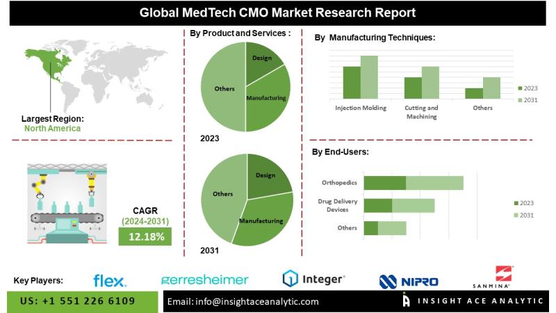 InsightAce Analytic Pvt. Ltd. announces the release of a market assessment report on the "Global MedTech CMO Market Size, Share & Trends Analysis Report By Product and Services (Design, Manufacturing, Sterilization and Packaging, Others), Manufacturing Techniques (Injection Molding, Cutting and Machining, Extrusion, Blow Molding, Others), End-users (Drug Delivery Devices, Orthopedics, MIS, Surgical Instruments, IVD, Electromechanical, Medical Equipment, Others)- Market Outlook And Industry Analysis 2031"
