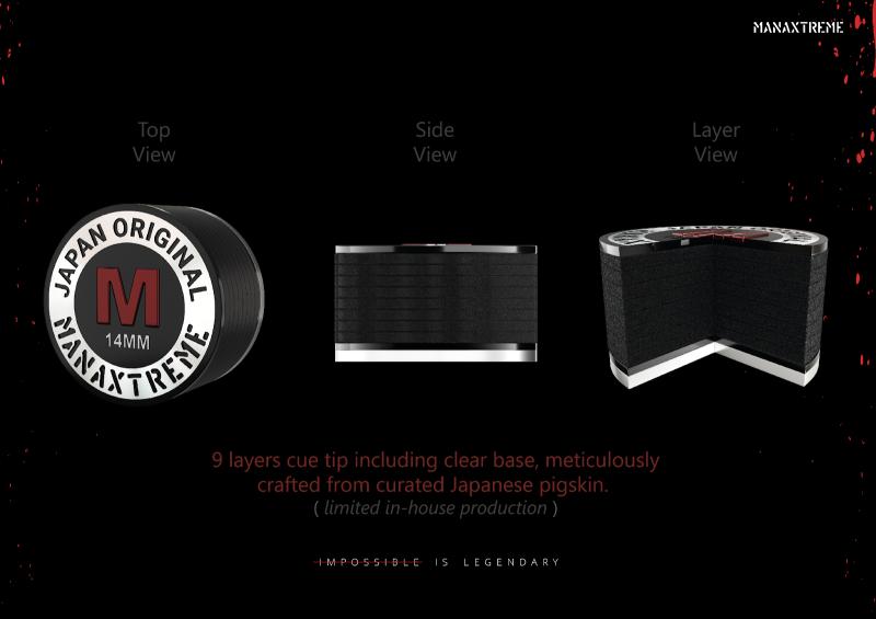 Manaxtreme's cue tips are constructed from premium-grade Japanese pigskin leather sourced for their dense collagen fiber structure, resulting in unparalleled strength and wear resistance. Each tip undergoes a specialized multi-layered lamination process that not only enhances elasticity but also ensures long-lasting performance, even under the most demanding conditions.