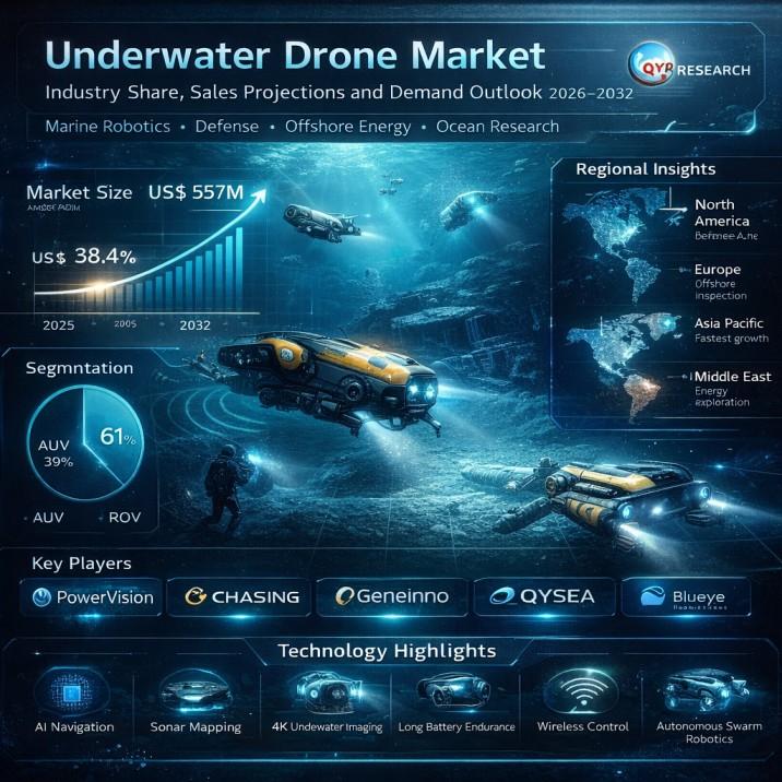 The global underwater drone market is entering a period of extraordinary expansion as autonomous ocean robotics transform marine exploration, inspection, and imaging. Valued at approximately US$ 587 million in 2025, the market is projected to reach US$ 5.55 bllion by 2032, registering a remarkable CAGR of 38.4% during the forecast period. Advances in artificial intelligence, battery technology, underwater imaging, and sensor integration are accelerating adoption across defense, offshore…