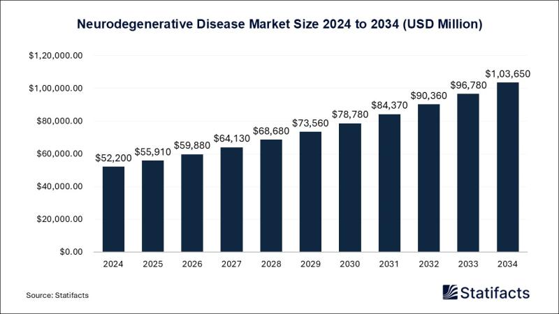 Price- USD 1550, According to Statifacts, The global neurodegenerative disease market size is valued at approximately USD 52,200 million in 2024 and is projected to nearly double, reaching USD 1,03,350 million by 2034, with a robust compound annual growth rate (CAGR) of 7.1% during the forecast period.The neurodegenerative disease market is witnessing unprecedented growth, driven by rising global prevalence, advances in medical technology, and increased investment in research and development.