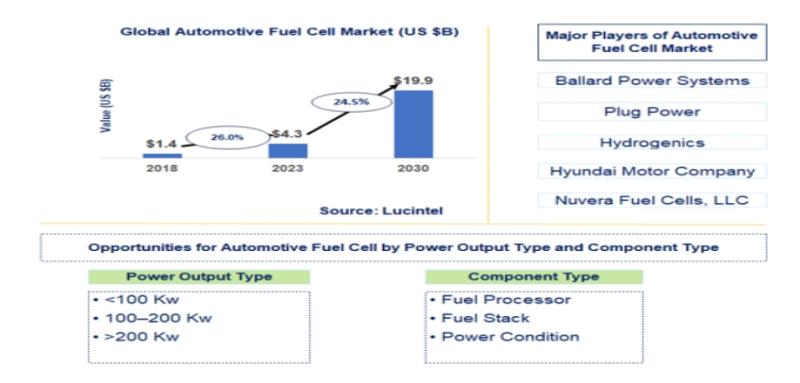 According to a market report by Lucintel, the future of the global automotive fuel cell market [https://www.lucintel.com/automotive-fuel-cell-market.aspx] looks promising with opportunities in the fuel processor, fuel stack, and power condition markets. The global automotive fuel cell market is expected to reach an estimated $19.9 billion by 2030 from $4.3 billion in 2023, at a CAGR of 24.5% from 2023 to 2030. The major drivers for this market are increasing demand for zero-emission vehicles, rising government subsidies as tax benefits to promote fuel cell vehicles, and growing concerns for environmental pollution.