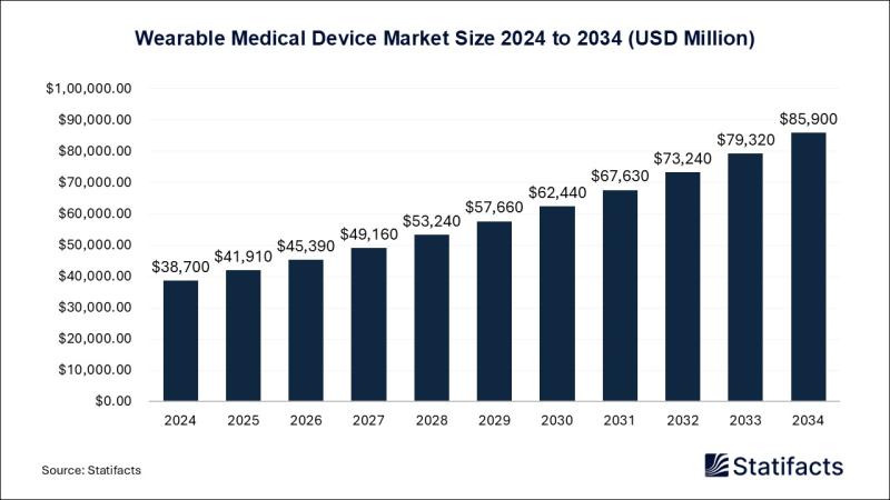 Price- USD 1550, According to Statifacts, The global wearable medical device market is on a rapid growth trajectory, with the market size projected to reach approximately USD 38.7 billion in 2024. By 2034, this figure is expected to nearly double, reaching USD 85.9 billion. This growth reflects a compound annual growth rate (CAGR) of 8.3% from 2024 to 2034. The surge in demand for wearable medical devices is being fueled by a combination of factors such as technological advancements, the increasing prevalence of chronic diseases, and the shift towards more personalized healthcare.๐๐ข๐๐ฐ ๐๐๐ญ๐๐ข๐ฅ๐๐ ๐๐๐ญ๐๐ฌ๐๐ญ@ https://www.statifacts.com/outlook/wearable-medical-device-market