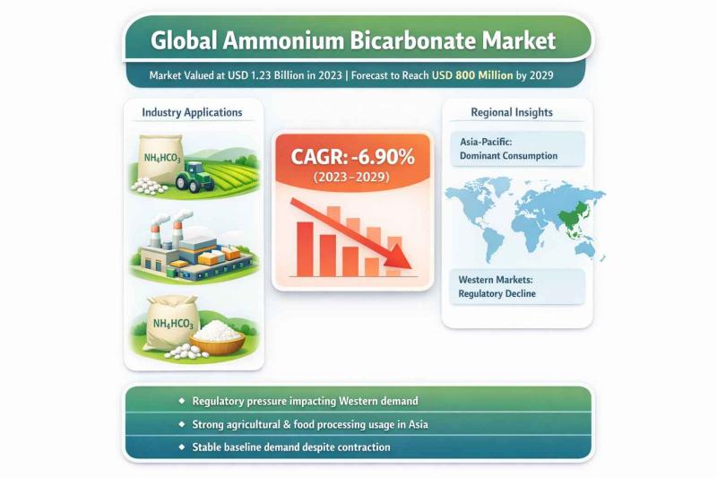 Global Ammonium Bicarbonate Market continues to demonstrate stable demand across multiple industries, with its valuation reaching USD 1.23 billion in 2023. According to the latest industry analysis, the market is projected to decline to USD 800 million by 2029, exhibiting a CAGR of -6.90% during the forecast period. This contraction is attributed to regulatory shifts in Western markets, while Asia-Pacific continues to dominate consumption due to strong agricultural and food…