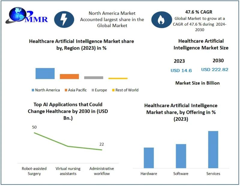 ๐๐๐๐ฅ๐ญ๐ก๐๐๐ซ๐ ๐๐ซ๐ญ๐ข๐๐ข๐๐ข๐๐ฅ ๐๐ง๐ญ๐๐ฅ๐ฅ๐ข๐ ๐๐ง๐๐ ๐๐๐ซ๐ค๐๐ญ ๐๐ฏ๐๐ซ๐ฏ๐ข๐๐ฐThe global healthcare artificial intelligence market has been gaining momentum due to advancements in machine learning, natural language processing, and predictive analytics. Valued at USD 14.6 billion in 2023, the market is anticipated to grow at a CAGR of 47.6 % during the forecast period (2024-2030), reaching a projected size of USD 222.82 billion by 2030.