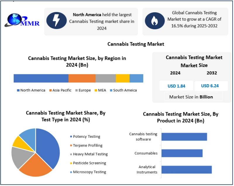 The Global Cannabis Testing Market was valued at approximately USD 1.84 Bn in 2024 and is projected to grow at a CAGR of 16.5 %, reaching USD 6.24 Bn by 2032.