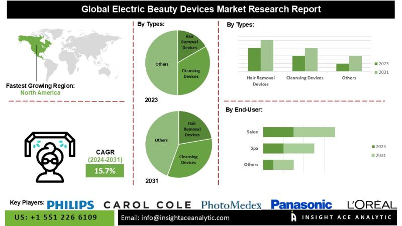 InsightAce Analytic Pvt. Ltd. announces the release of a market assessment report on the "Electric Beauty Devices Market"-, By Types (Hair Removal Devices, Cleansing Devices, Acne Devices, Light/LED Therapy and Photorejuvenation Devices, Oxygen and Steaming Devices, Hair Growth Devices, Skin Dermal Rollers, Cellulite Reduction Devices, Others), By End-User (Salon, Spa, At Home, Others), and Global Forecasts, 2024-2031 And Segment Revenue and Forecast To 2031."