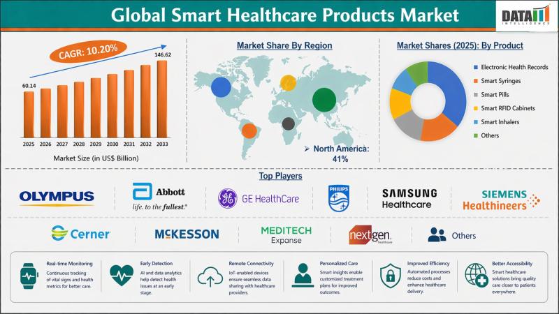 The global smart healthcare products market was valued at USD 60.14 billion in 2025 and is estimated to reach USD 146.62 billion by 2033, growing at a CAGR of 10.2% during the forecast period from 2026 to 2033. The market is witnessing significant growth driven by the increasing adoption of connected healthcare technologies and the rising demand for remote patient monitoring solutions.