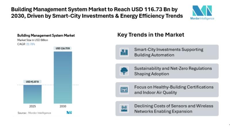 The building management system market [https://www.mordorintelligence.com/industry-reports/building-management-system-market?utm_source=abnewswire] stood at USD 41.87 billion in 2025 and is expected to reach USD 116.73 billion by 2030, registering a 22.78% CAGR. These factors are contributing significantly to the overall Building Management System Market size.