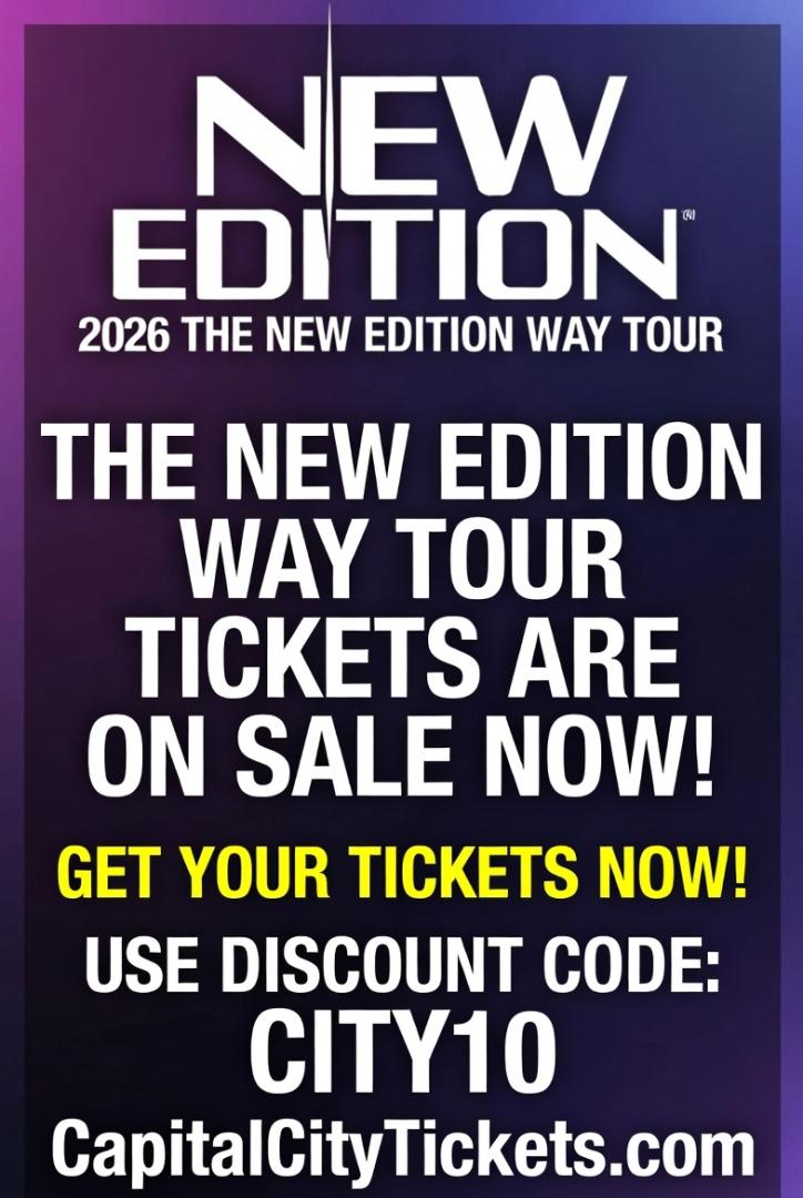 See New Edition live on The New Edition Way Tour in 2026! Score discounted tickets with promo code CITY10 at CapitalCityTickets.com. Check full tour dates, secure the best seats, and access exclusive deals. Don't miss your chance to experience this legendary R&B group live-grab your tickets now and save big on an unforgettable concert event.