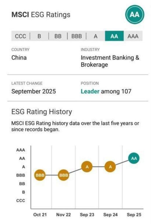 MSCI, the international index provider, recently released its 2025 ESG (Environmental, Social and Governance) rating for China Securities Co., Ltd. (601066.SH; 6066.HK). The Company's rating was raised from "A" to "AA", representing another steady advancement along its ESG journey.