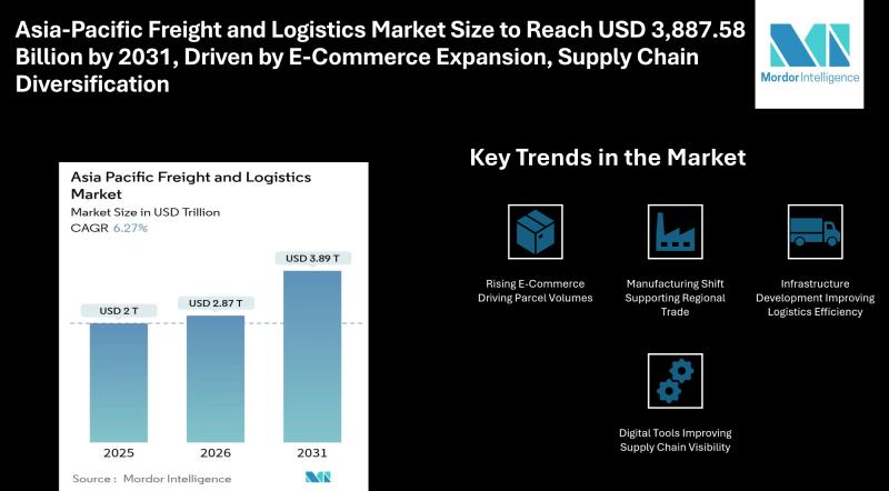 According to Modor intelligence, the Asia-Pacific freight and logistics market size is estimated at USD 2,868.36 billion in 2026, increasing from USD 2,698.38 billion in 2025 and projected to reach USD 3,887.58 billion by 2031, registering a CAGR of…
