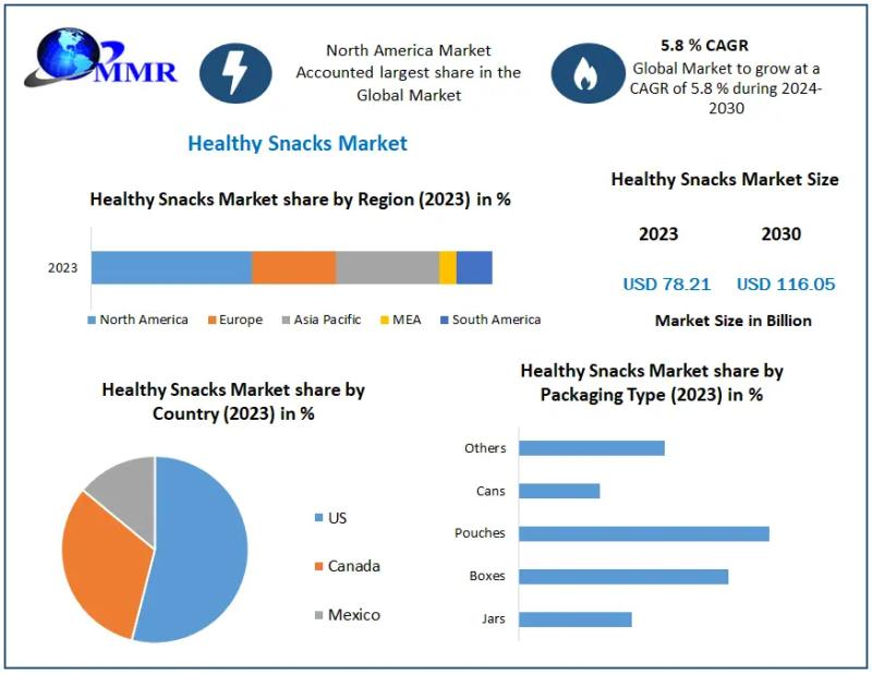 ๐๐ฅ๐จ๐๐๐ฅ ๐๐๐๐ฅ๐ญ๐ก๐ฒ ๐๐ง๐๐๐ค๐ฌ ๐๐๐ซ๐ค๐๐ญ ๐๐ซ๐จ๐ฃ๐๐๐ญ๐๐ ๐ญ๐จ ๐๐๐๐๐ก ๐๐๐ 116.05 ๐๐ข๐ฅ๐ฅ๐ข๐จ๐ง ๐๐ฒ 2030The global healthy snacks market, valued at USD 78.21 billion in 2023, is anticipated to reach USD 116.05 billion by 2030, exhibiting a compound annual growth rate (CAGR) of 5.8% during the forecast period.This growth is driven by increasing health consciousness among consumers, a shift towards balanced nutrition, and the rising demand for convenient, nutritious snack options. The market encompasses a variety of products, including nuts, seeds, trail mixes, and snack bars, catering to diverse consumer preferences.