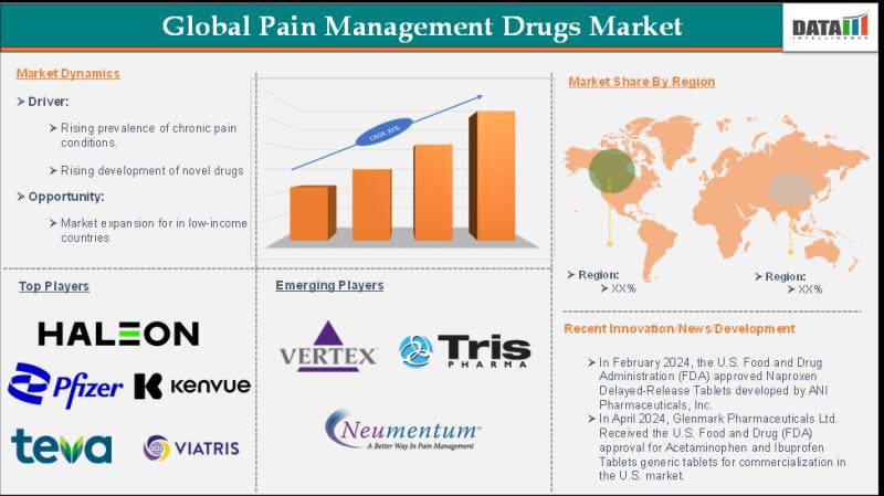 Pain management drugs are medications designed to alleviate or control pain caused by various conditions, including injuries, surgeries, chronic illnesses, or neurological disorders. These drugs work by targeting the body's pain pathways, either by blocking pain signals, reducing inflammation, or altering the brain's perception of pain. They include categories such as analgesics (e.g., opioids, acetaminophen), nonsteroidal anti-inflammatory drugs (NSAIDs), anticonvulsants, antidepressants, and topical agents, tailored to address different types and intensities of pain.Forecast Growth Projected: