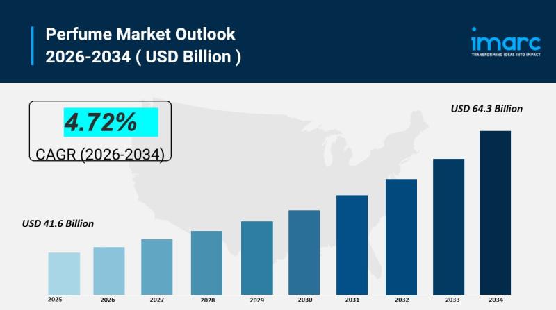 The global Perfume Market was valued at USD 41.6 Billion in 2025 and is forecast to reach USD 64.3 Billion by 2034, growing at a CAGR of 4.72% during 2026-2034. This growth is driven by changing consumer trends and preferences, growing disposable income levels, rapid expansion of e-commerce and online retail, rising innovation in product development and marketing strategies, and expanding presence in emerging markets through globalization.