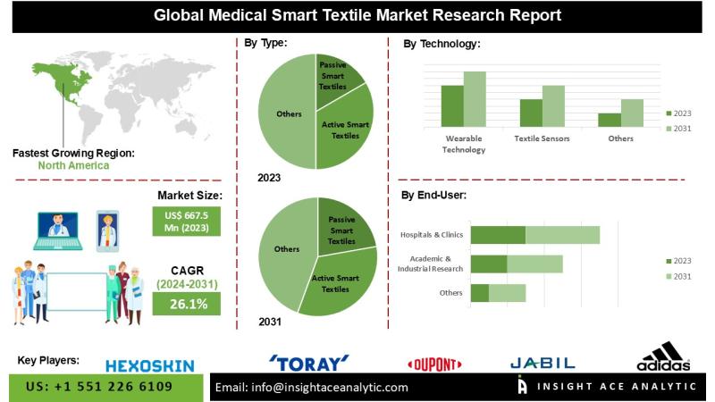 InsightAce Analytic Pvt. Ltd. announces the release of a market assessment report on the "Global Medical Smart Textile Market- (By Type (Passive Smart Textiles, Active Smart Textiles, Ultra-Smart Textiles) By End-user (Hospitals & Clinics, Academic & Industrial Research), By Region, Trends, Industry Competition Analysis, Revenue and Forecast To 2031."According to the latest research by InsightAce Analytic, the Global Medical Smart Textile Market is valued at US$ 667.5 Mn in 2023, and it is expected to reach US$ 4,077.0 Mn by 2031, with a CAGR of 26.1% during the forecast period of 2024-2031.