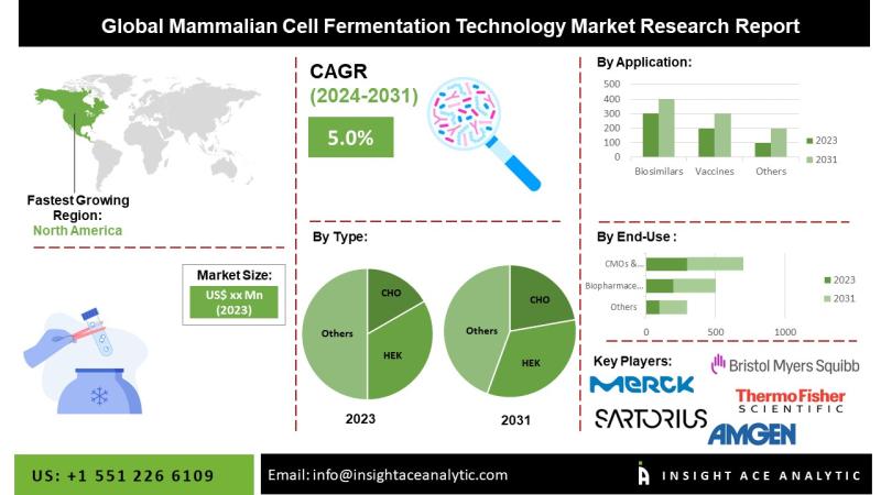 InsightAce Analytic Pvt. Ltd. announces the release of a market assessment report on the "Global Mammalian Cell Fermentation Technology Market Size, Share & Trends Analysis Report By Type (Human Embryonic Kidney (HEK) Cell Fermentation, Baby Hamster Kidney (BHK) Cell Fermentation, Murine Myeloma Cell Fermentation, Medical Research Council Cell Strain - 5 (MRC-5) Fermentation ), Application (Monoclonal Antibodies, Recombinant Proteins, Biosimilars, Vaccines, Enzymes) And End-Use (Biopharmaceutical Companies, CMOs & CDMOs and Academic and Research Institutes) - Market Outlook And Industry Analysis 2031"The Global Mammalian Cell Fermentation Technology Market is estimated to exhibit a CAGR of 4.80% during the forecast period.
