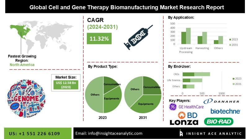 InsightAce Analytic Pvt. Ltd. announces the release of a market assessment report on the "Global Cell and Gene Therapy Bio-manufacturing Market Size, Share & Trends Analysis Report By Product Type (Consumables, Equipment, And Software Solutions), Usage (Commercial-Stage Manufacturing And Research-Stage Manufacturing), Application (Upstream Processing, Harvesting, And Downstream Processing), And End-User (Life Science Companies, Contract Research Organizations (Cros), Contract Manufacturing Organizations (CMOs), And Cell Banks)- Market Outlook And Industry Analysis 2031"The global cell and gene therapy bio-manufacturing market is estimated to reach over USD 29.34 billion by 2031, exhibiting a CAGR of 11.25% during the forecast period.