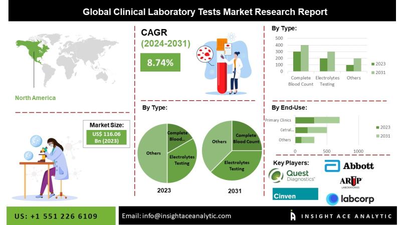 InsightAce Analytic Pvt. Ltd. announces the release of a market assessment report on the "Global Clinical Laboratory Tests Market Size, Share & Trends Analysis Report By Type (Complete Blood Count, HGB/HCT Testing, Basic Metabolic Panel Testing, BUN Creatinine Testing, Electrolytes Testing, HbA1c Testing, Comprehensive Metabolic Panel Testing, Liver Panel Testing (Hepatitis, Bile Duct Obstruction, Liver Cirrhosis, Liver Cancer, Bone Disease, Autoimmune Disorders, Others) Renal Panel Testing, Lipid Panel Testing, and Cardiovascular Panel Testing), By End-use (Central Laboratories, Primary Clinics)- Market Outlook And Industry Analysis 2031"The global Clinical Laboratory Tests market is estimated to reach over USD 221.50 billion by 2031, exhibiting a CAGR of 8.46% during the forecast period.